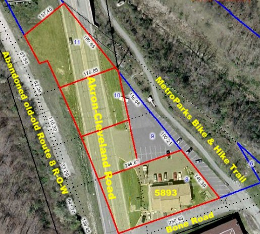 The restaurant and its parking lie on a group of four parcels (#1300030,#1300031, #1300032,#1300033), totalling a bit less than 1 acre. Parts of all these lots are taken up by Akron-Cleveland Road to the west. This appears to be the result of "old" Route 8's relocation in the early 1950s when its right-of-way was shifted eastward to align with the old Interurban Railway roadbed, and widened to four lanes. The restaurant is also hemmed in by the MetroParks Bike & Hike Trail to the east, and a stub of the old Bone Road to the south. (This is a bit of a mystery, since the Village vacated Bone Road years ago, but the County somehow resurrected it to provide access to the Bike & Hike Trail).